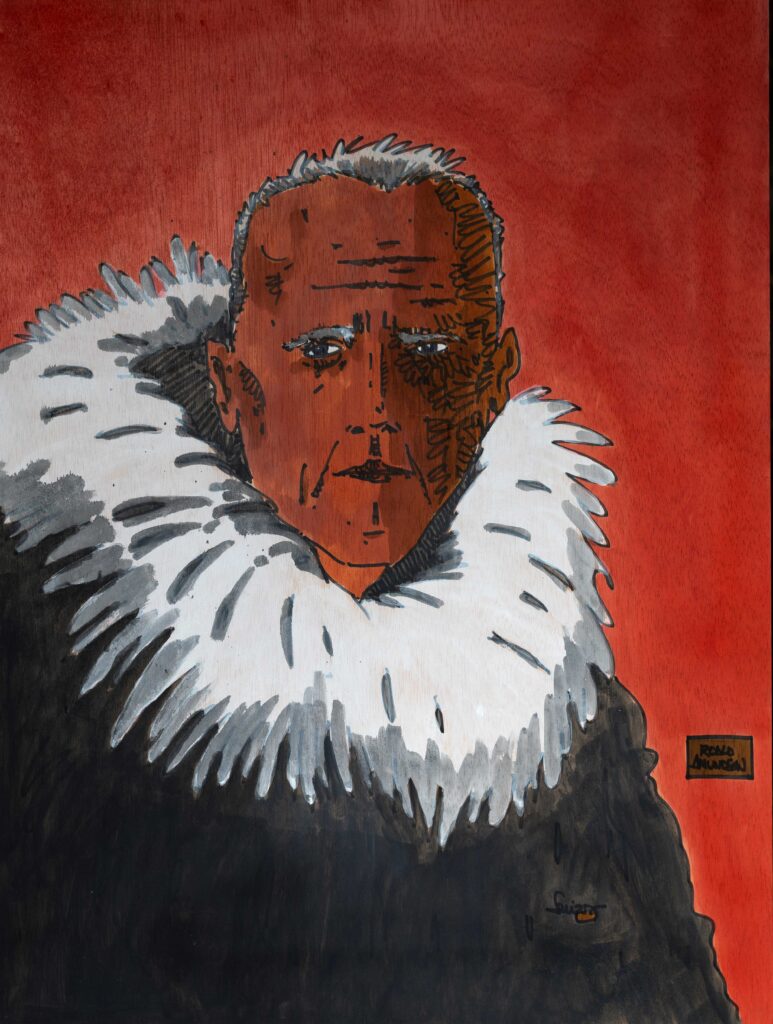 La propuesta artística consiste en 12 tablas, 10 de ellas son los retratos de los que, a mi juicio y el del prologuista Hilo Moreno, son los más grandes exploradores polares del siglo XX, por lo que han aportado en términos de hitos y hazañas en el medio polar y una última tabla en la que quiero reflejar una escena de la exploración polar, tratando de captar la dificultad que suponía moverse en ese medio con los medios de inicios del siglo XX y una última obra que es la paleta usada para mezclar los colores de la exposición.