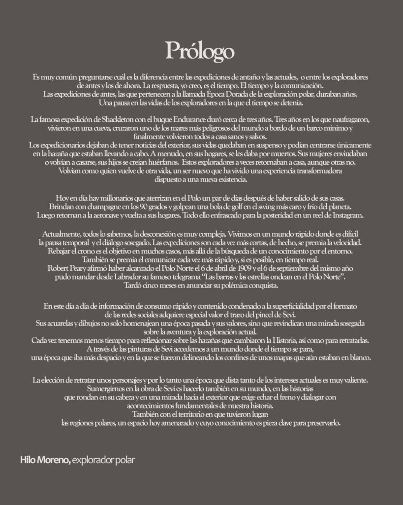 Complementan estos cuadros, para contextualizar y dar información más detallada sobre estos héroes y las condiciones a las que se enfrentaron, carteles explicativos como la biografía e hitos de cada uno de los exploradores, el cartel de la exposición, el cartel prólogo de la misma para el que he contado, de forma desinteresada, con un texto precioso e inspirador a cargo de mi amigo y explorador polar Hilo Moreno, el de presentación del artista y uno que hará de epílogo de la exposición con una frase que define muy bien el espíritu de estos valientes.